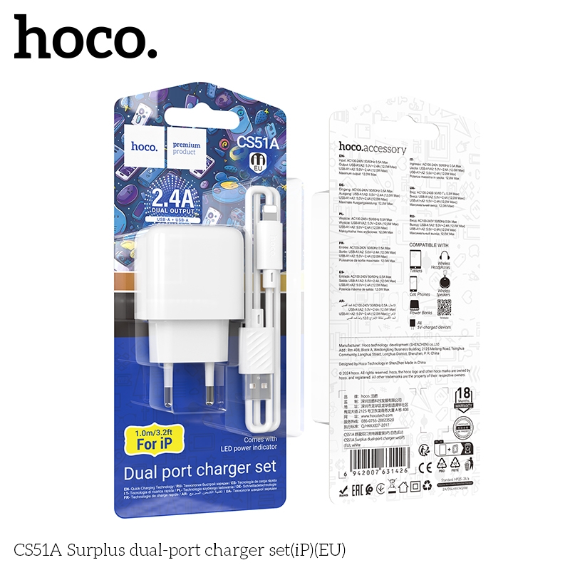 Bộ sạc 2 cổng Hoco CS15A iPhone EU (cóc 2 cổng, cáp usba- lightning; a-l)