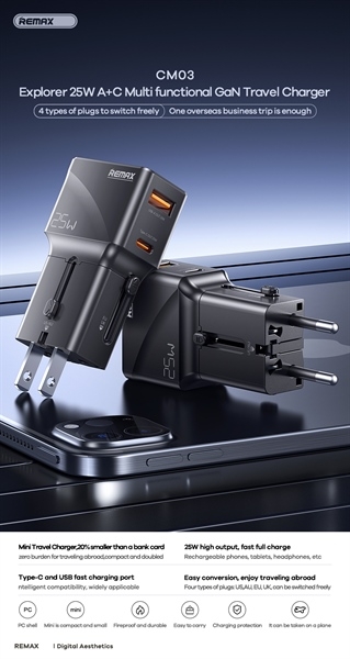 Bộ sạc ổ điện du lịch REMAX CM03 2500w kèm cóc sạc 25w (1 cổng type-c vs 1 cổng usb) đa năng chính hãng [BH 1 năm]