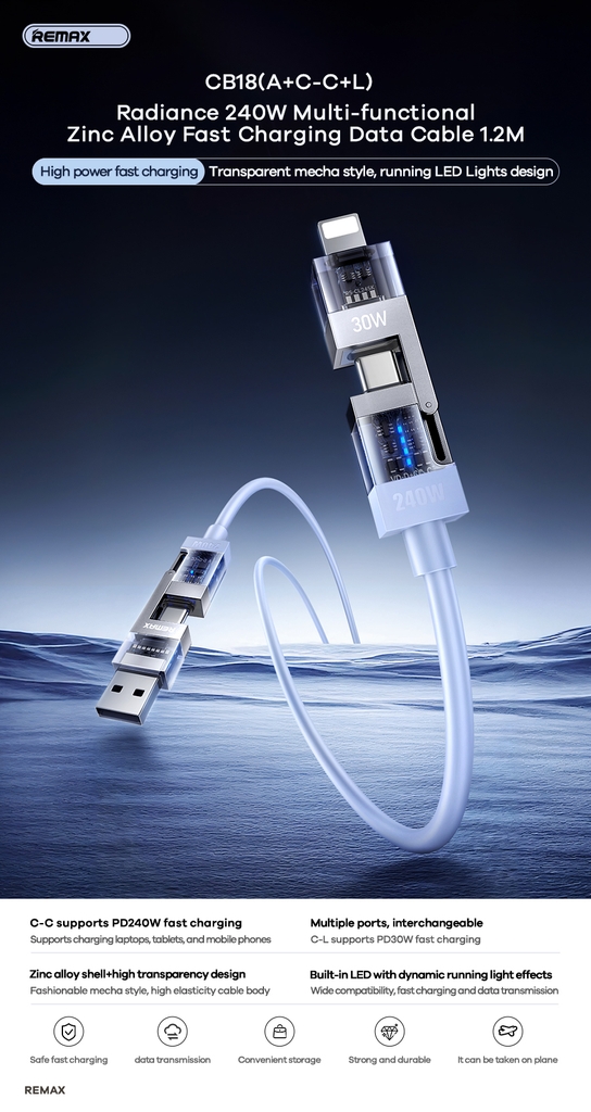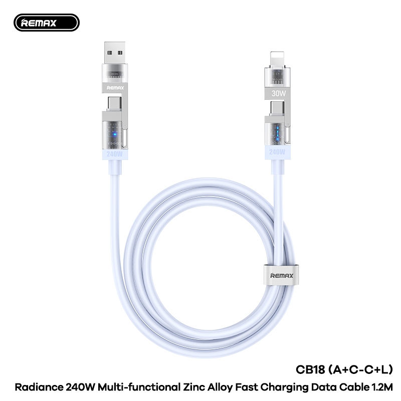 Cáp sạc đa năng 4 đầu REMAX CB18 cáp USB/Type C ra Type C/Iphone (A+C ra C+L) sạc nhanh 240w dài 1m2 chính hãng