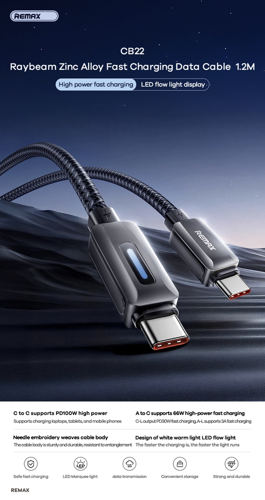 Cáp sạc nhanh 240w REMAX CB22 C-C cáp TypeC ra Type C chất liệu hợp kim dài 1m2 có đèn led siêu đẹp