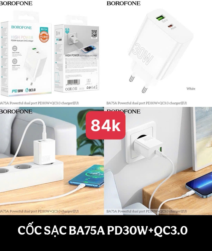 Cóc sạc nhanh PD30W+ qc3.0 BOROFONE BA75A 2 Cổng ( 1 usb a+ 1 type c)