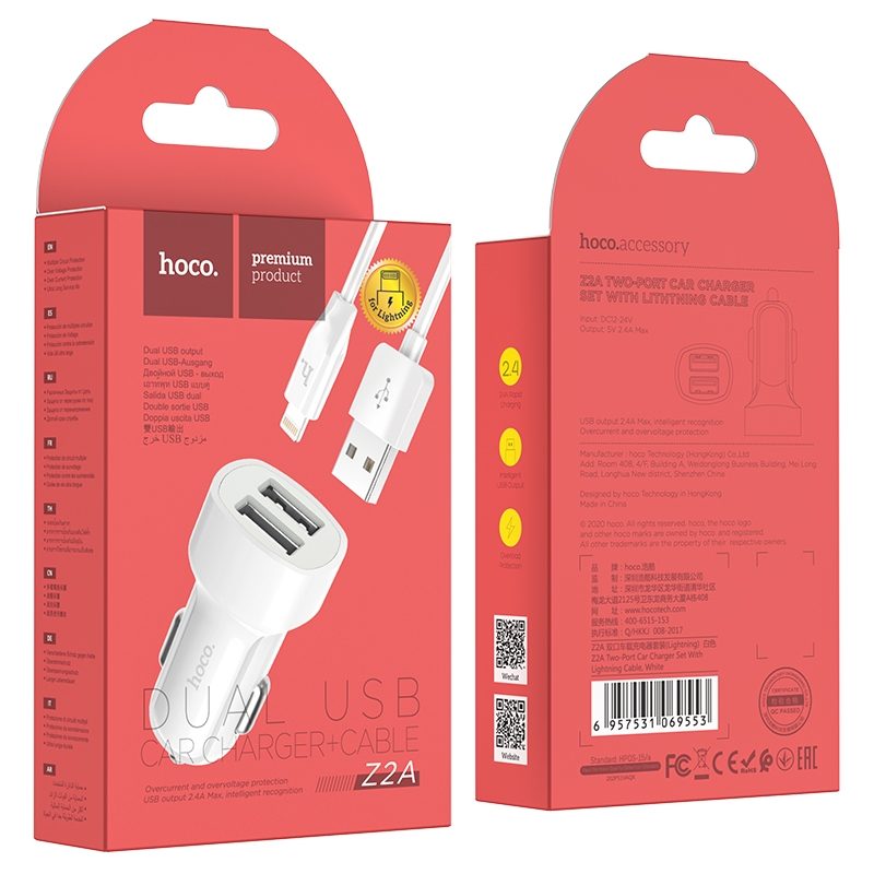 Cóc sạc/ tẩu sạc xe hơi Hoco Z2 iPhone (1 cổng USBA kèm cáp A-L)