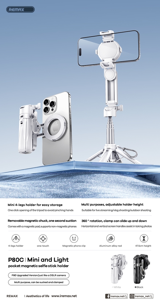 Gậy chụp hình REMAX P80C gậy vừa kẹp vừa hít nam châm từ tính siêu mạnh chống rớt chính hãng