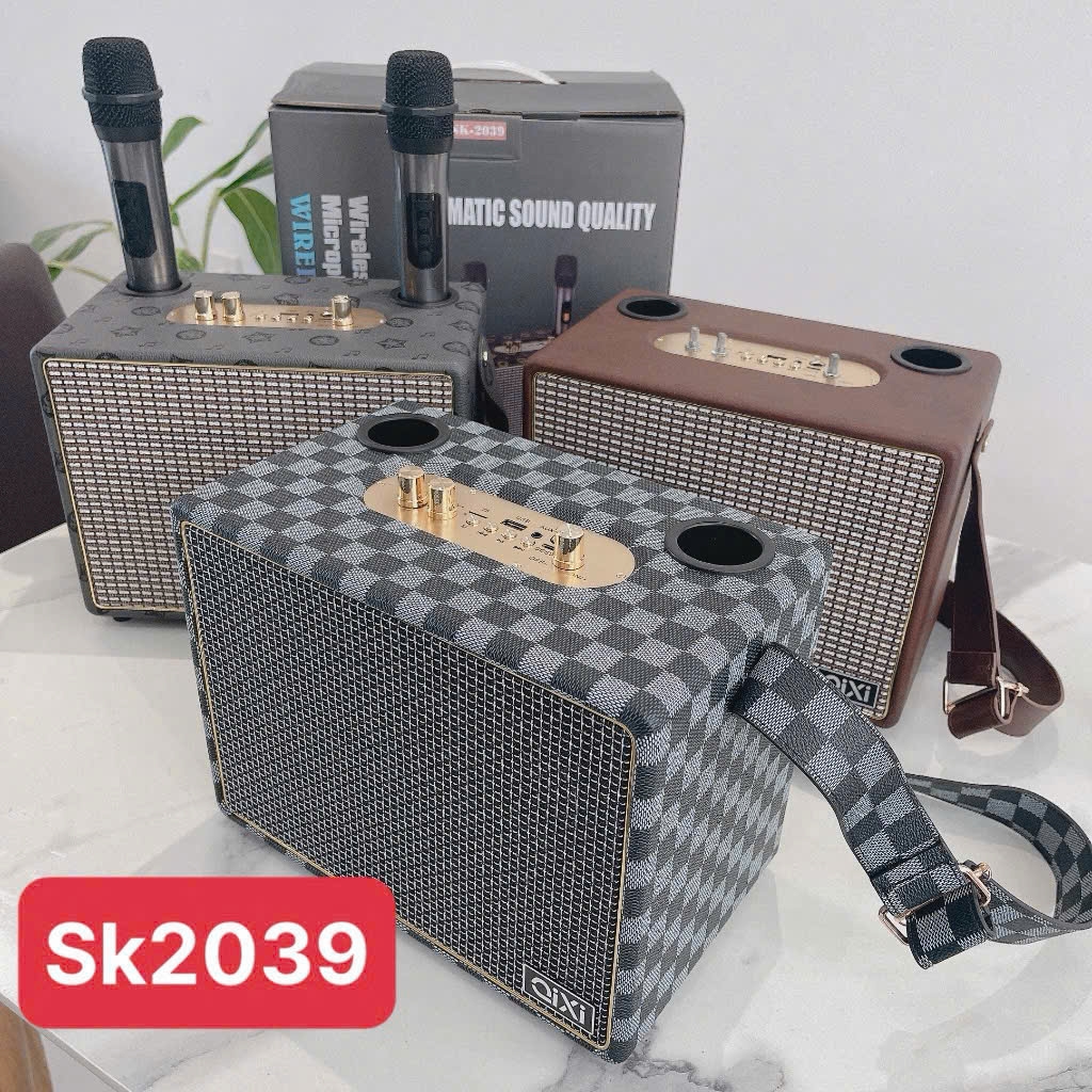 Loa bluetooth karaoke QIXI SK2039 mẫu loa để bàn có quai xách kèm 2 micro không dây siêu hay