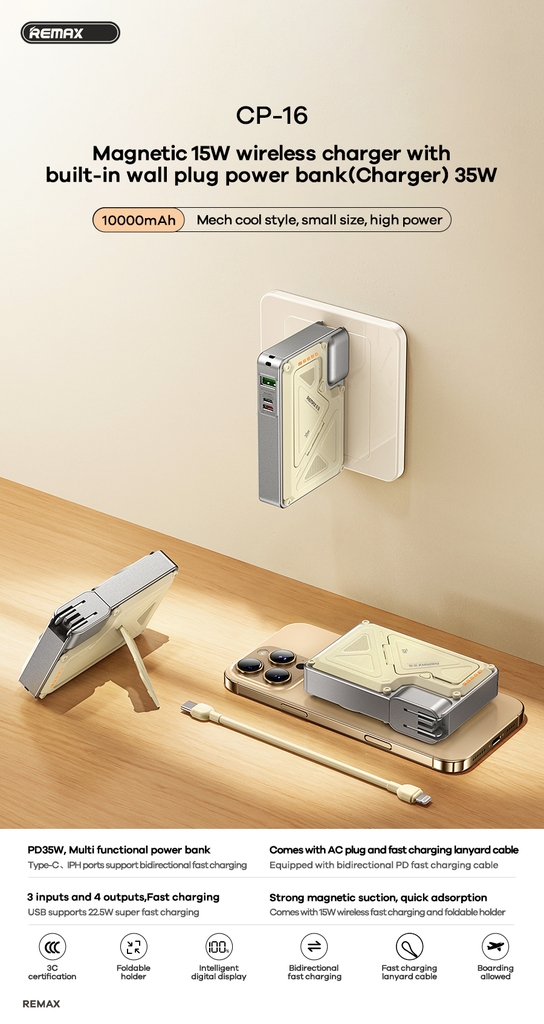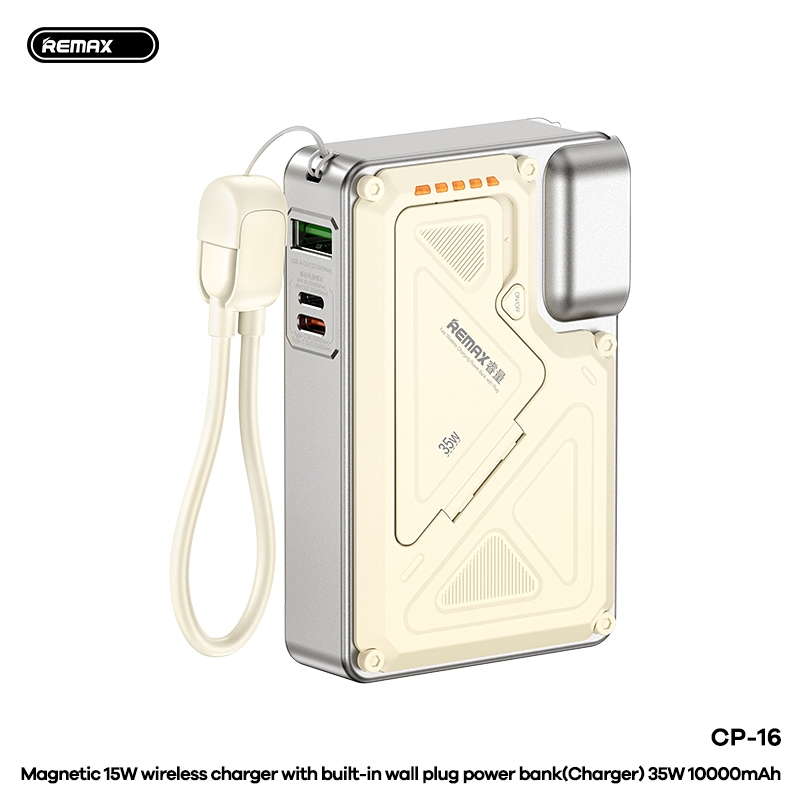 Pin sạc dự phòng REMAX CP-16 10.000mAh sạc không dây 15W sạc dây 35W tích hợp phích cắm 220v chính hãng [BH 1 Năm]