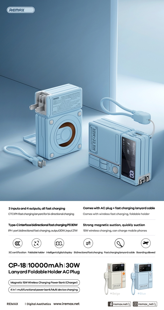 Pin sạc dự phòng REMAX CP-18 10.000mAh sạc không dây 15w sạc dây 30w kèm phích cắm điện 220v chính hãng