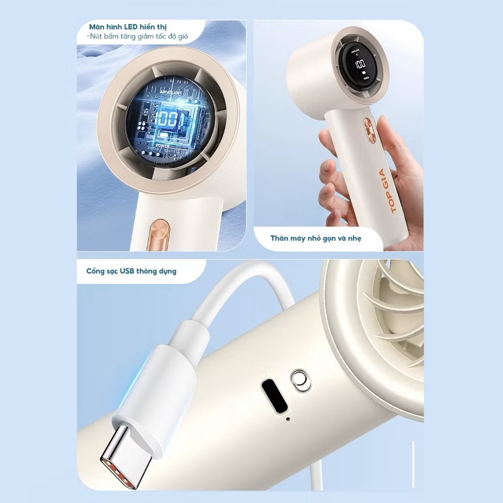 Quạt tích điện cầm tay Topgia có màn hình hiền thị [BH: 1 Tuần]