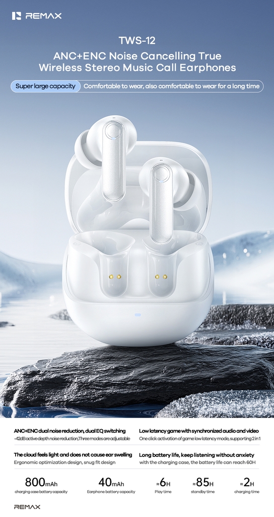 Tai nghe bluetooth REMAX TWS-12 tai TRUE WIRELESS chống ồn chủ động ANC+ENC chính hãng