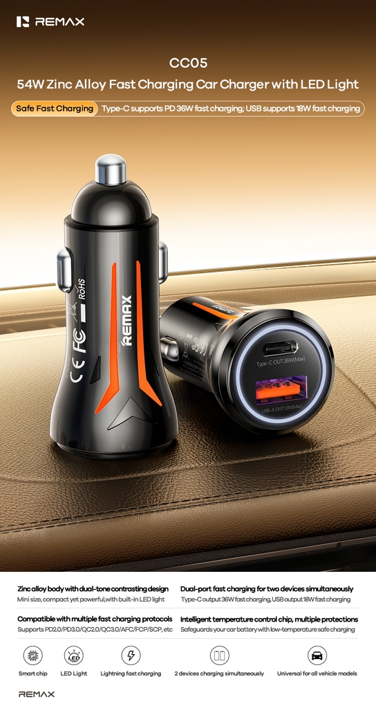 Tẩu sạc nhanh REMAX CC05 tẩu sạc xe hơi ô tô sạc nhanh 54w tẩu 2 cổng 1 cổng sạc USB 1 cổng sạc Type C kèm bluetooth siêu tiện lợi